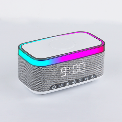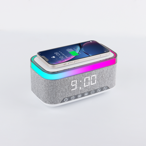 Logotipo personalizado 15W Carga rápida del teléfono inalámbrico Luz LED Despertador Cargador inalámbrico con altavoz Bluetooth