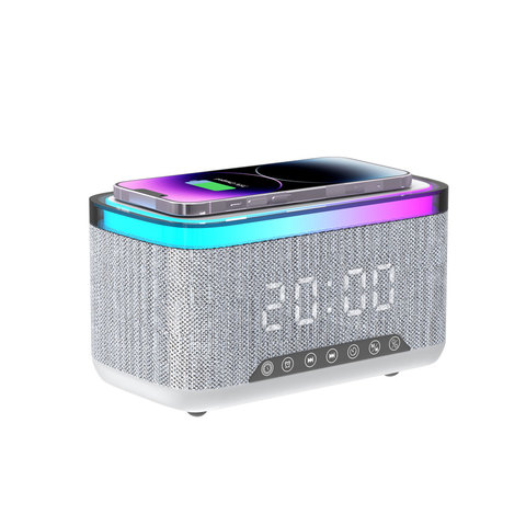 Cargador inalámbrico rápido de 15W personalizado al por mayor, soporte de escritorio, estación de acoplamiento, radio, reloj despertador, altavoz cargador de teléfono inalámbrico